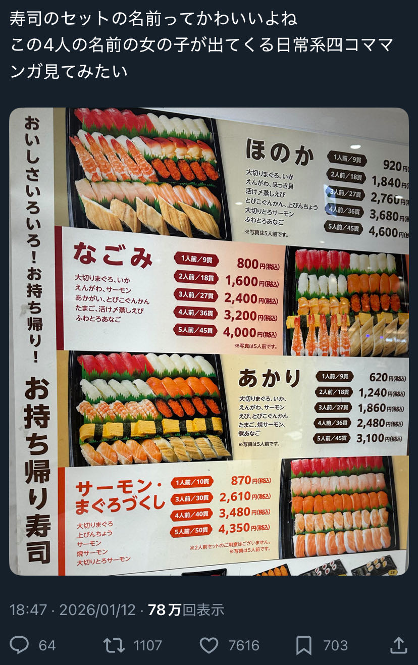 | … | 426/01/13(火)02:09:54No.1392021545+サーモンまぐろづくしにも何か名前つけてあげてよ… |
