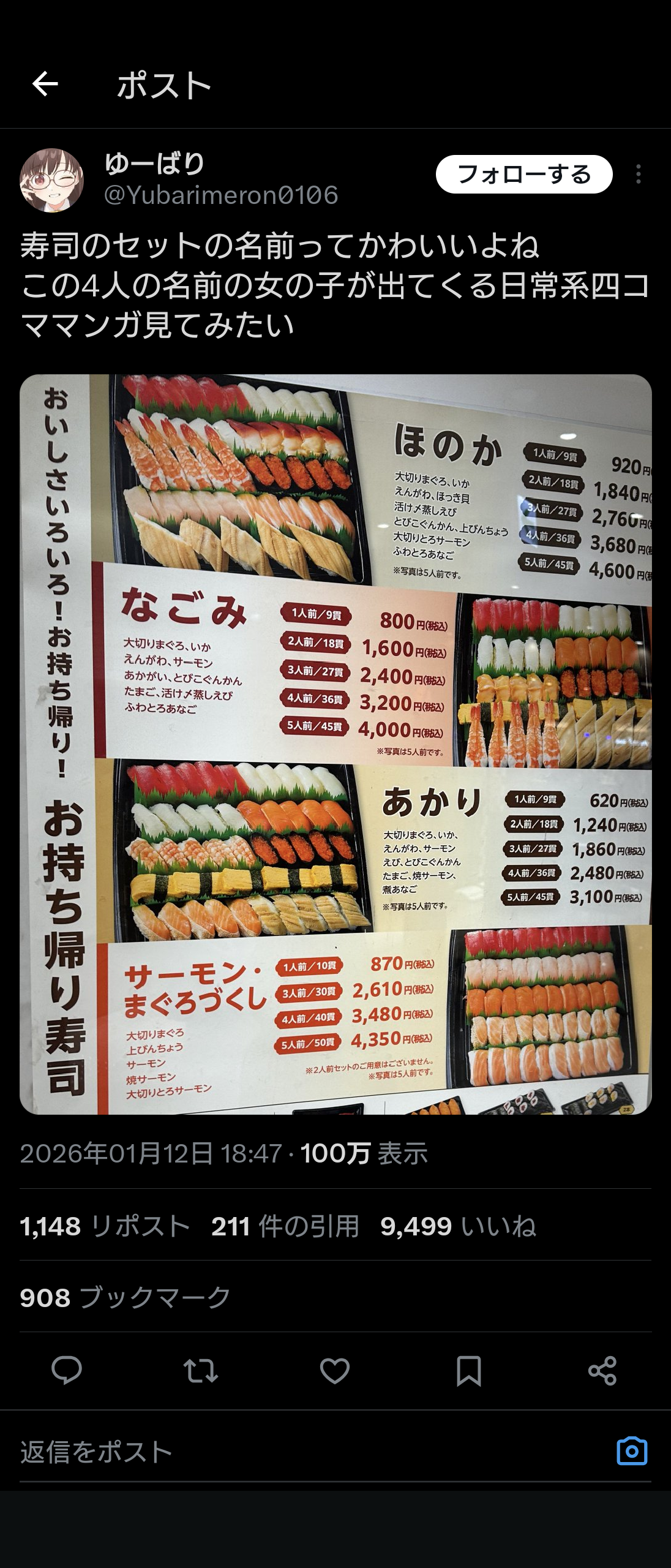 | … | 1126/01/13(火)05:28:46No.1392030313そうだねx4親は何を考えてサーモンまぐろづくしなんて付けたんだよ |