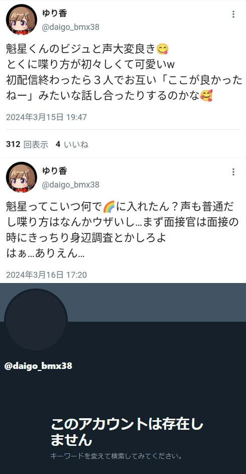 | … | 11226/01/13(火)12:06:28No.1392073660+>なんでまた魁星くんを誹謗中傷した? |