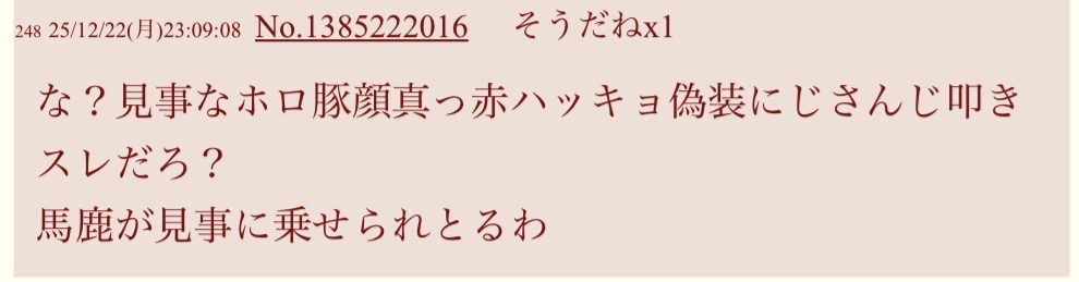 | … | 4026/01/13(火)12:24:58No.1392078730そうだねx21別の事務所所属してるタレントを公然と誹謗中傷してる行為自体がタレントとして終わってる事にさえ気づけなくなってるのが |
