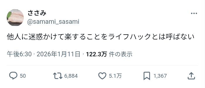 | … | 526/01/13(火)17:21:25No.1392138718そうだねx3あくらつなライフハックだから他人に迷惑かけていいんですよ…! |