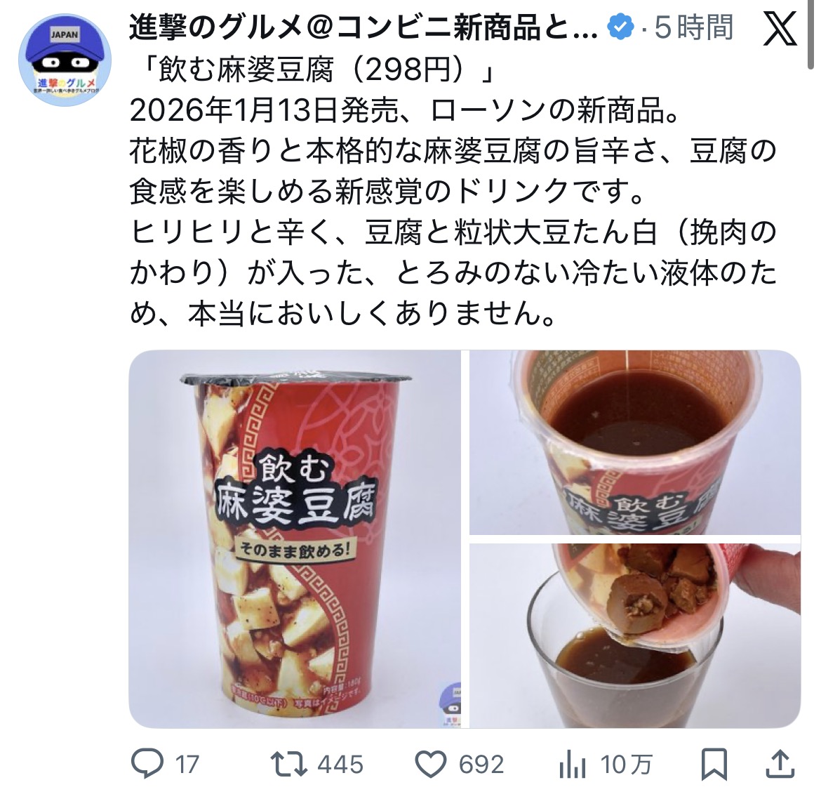 | … | 19326/01/13(火)18:53:42No.1392163327+今回発売する商品は、冷やしてお召し上がりいただく、飲むタイプの麻婆豆腐です。本格的な麻婆豆腐の辛味や花椒のしびれ、絹ごし豆腐のなめらかな食感をお楽しみいただけます。「デザート系ではない料理を飲みたい」「小腹を満たすドリンクが欲しい」といったお声を受け、人気料理の一つである「麻婆豆腐」を「飲む◯◯シリーズ」として開発いたしました。 |