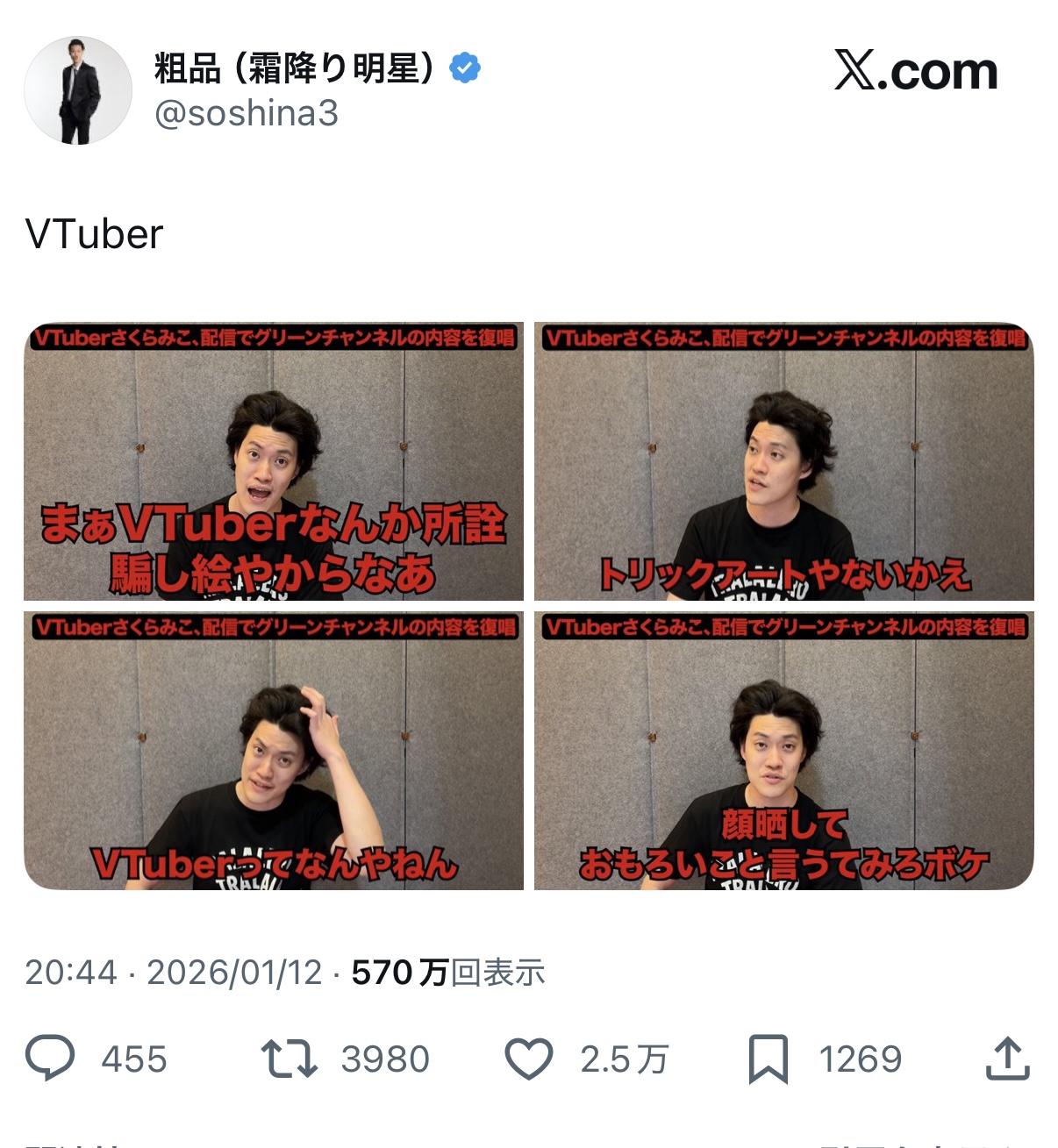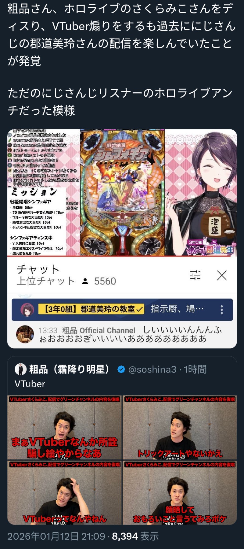 | … | 33826/01/13(火)23:05:24No.1392259995そうだねx3>めちゃくちゃ馬鹿にしてる粗品さんの事だしこの方達はVtuberじゃないんだよね? |