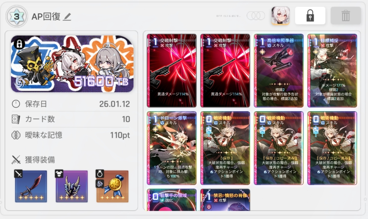 | … | 3026/01/13(火)22:53:20 ID:lmEvQ01QNo.1392255676+今回は排除圧縮に向いたイベカオスだったけど次は複製向きとかコスト緩和された後に一般カード重視とかも欲しいね |