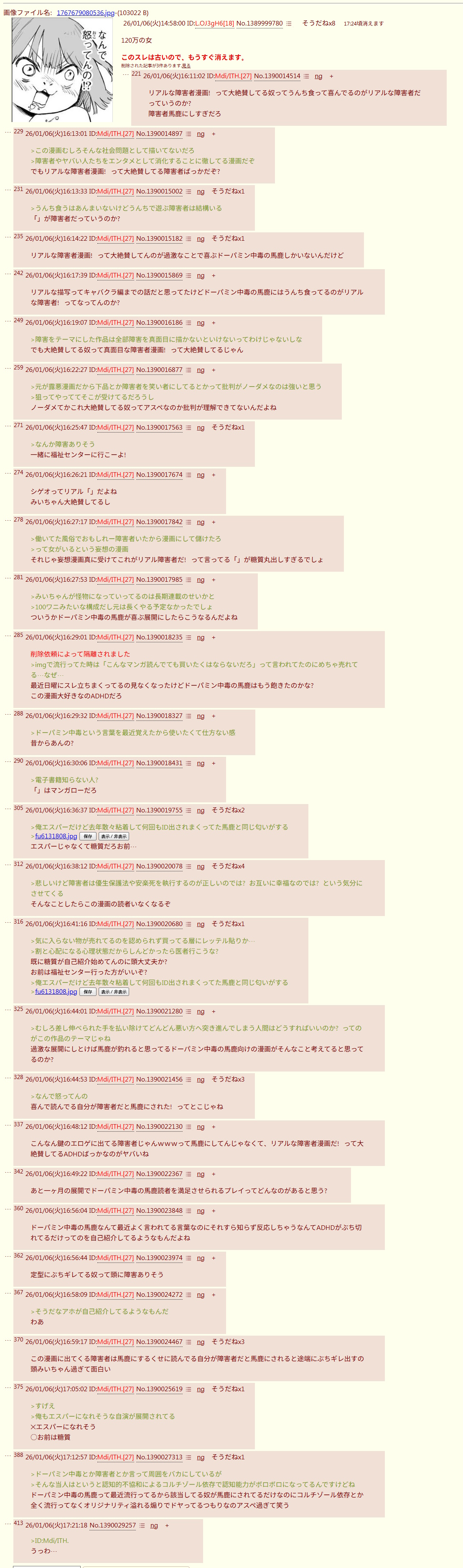| … | 21126/01/14(水)10:16:32No.1392342258+障害者を馬鹿にするのは儲かるからな |