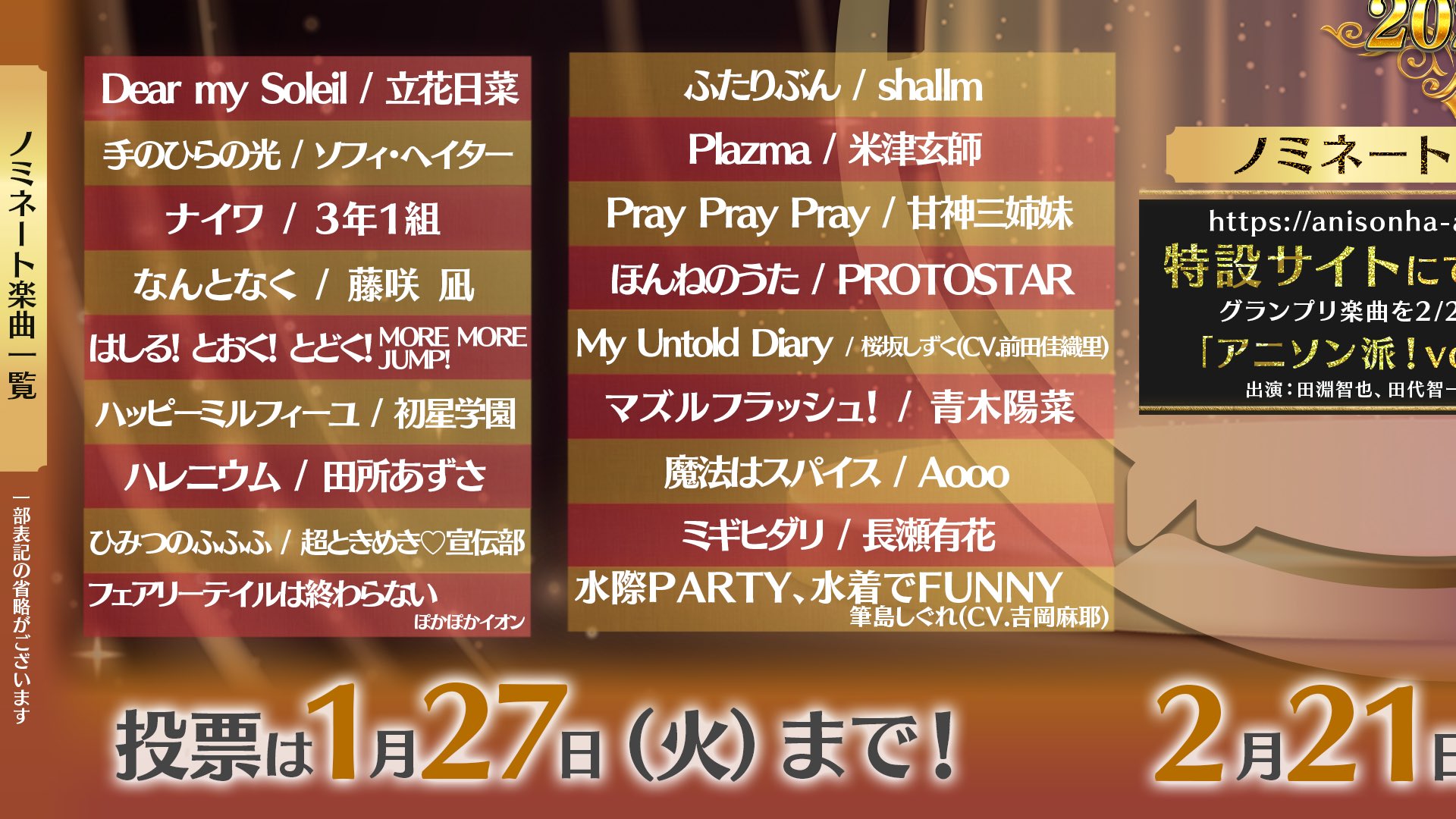 | … | 2026/01/14(水)12:12:41No.1392362337+投票ページで「アニメ」と検索しても35/80曲しかありませんわ |