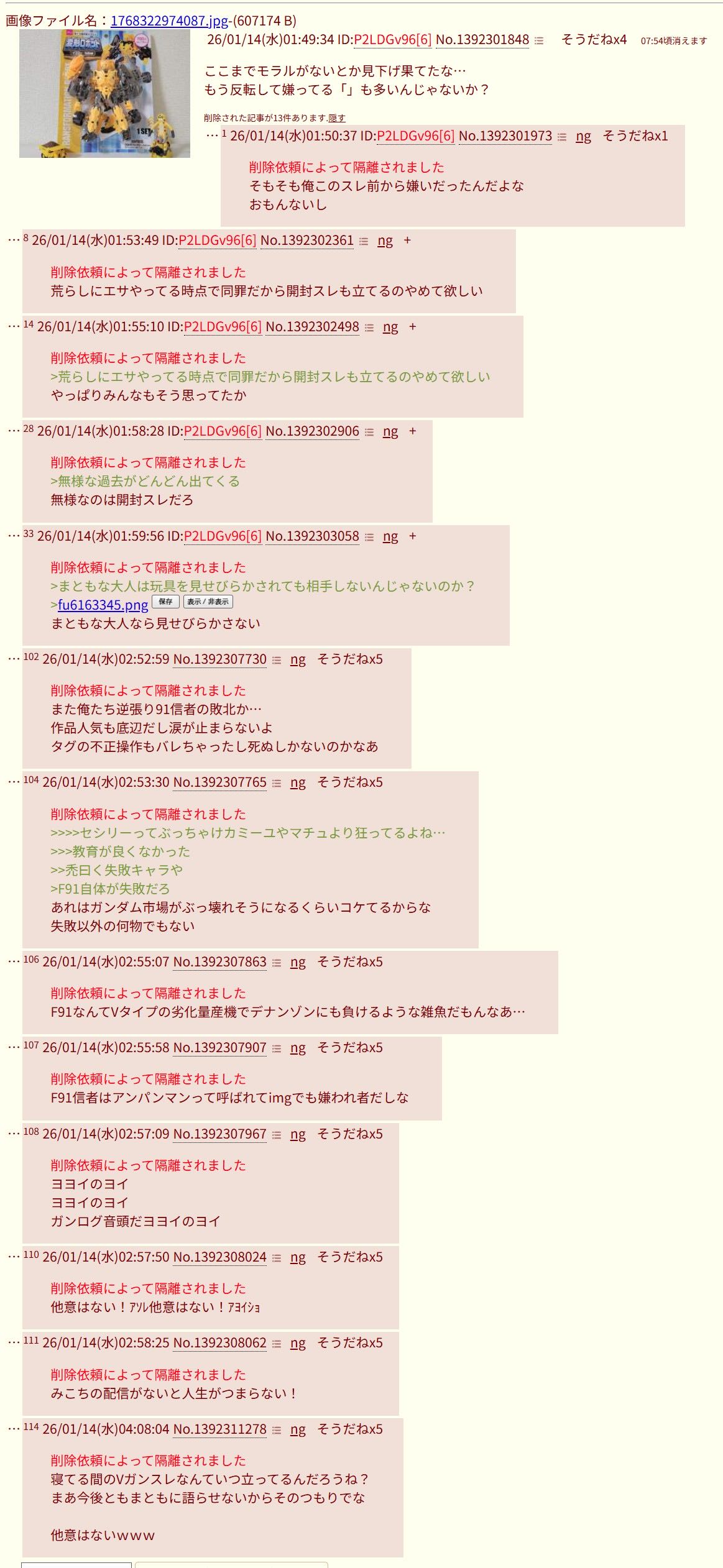 | … | 1026/01/14(水)14:14:20No.1392390792そうだねx7開封スレより自演で粘着スレ立てる奴の方が嫌われてるだろ |