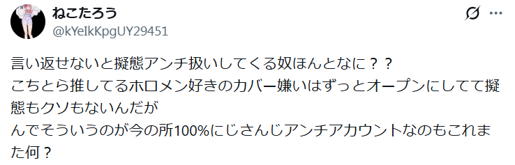 でも実際に同じコンテンツ楽しんでる層がやってた時はろくに調べもしないで矛先逸らそうとしてるだけの無能が出来上がるからね