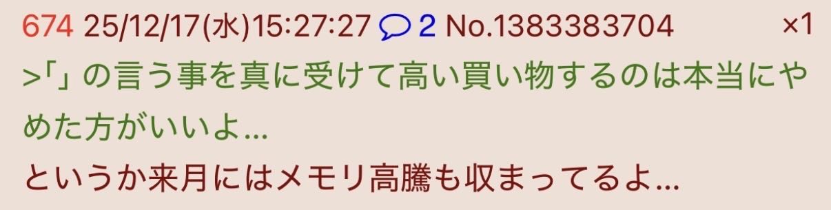 | … | 5526/01/14(水)16:38:22No.1392417124+中華メモリが出回り始めれば下がるでしょ |
