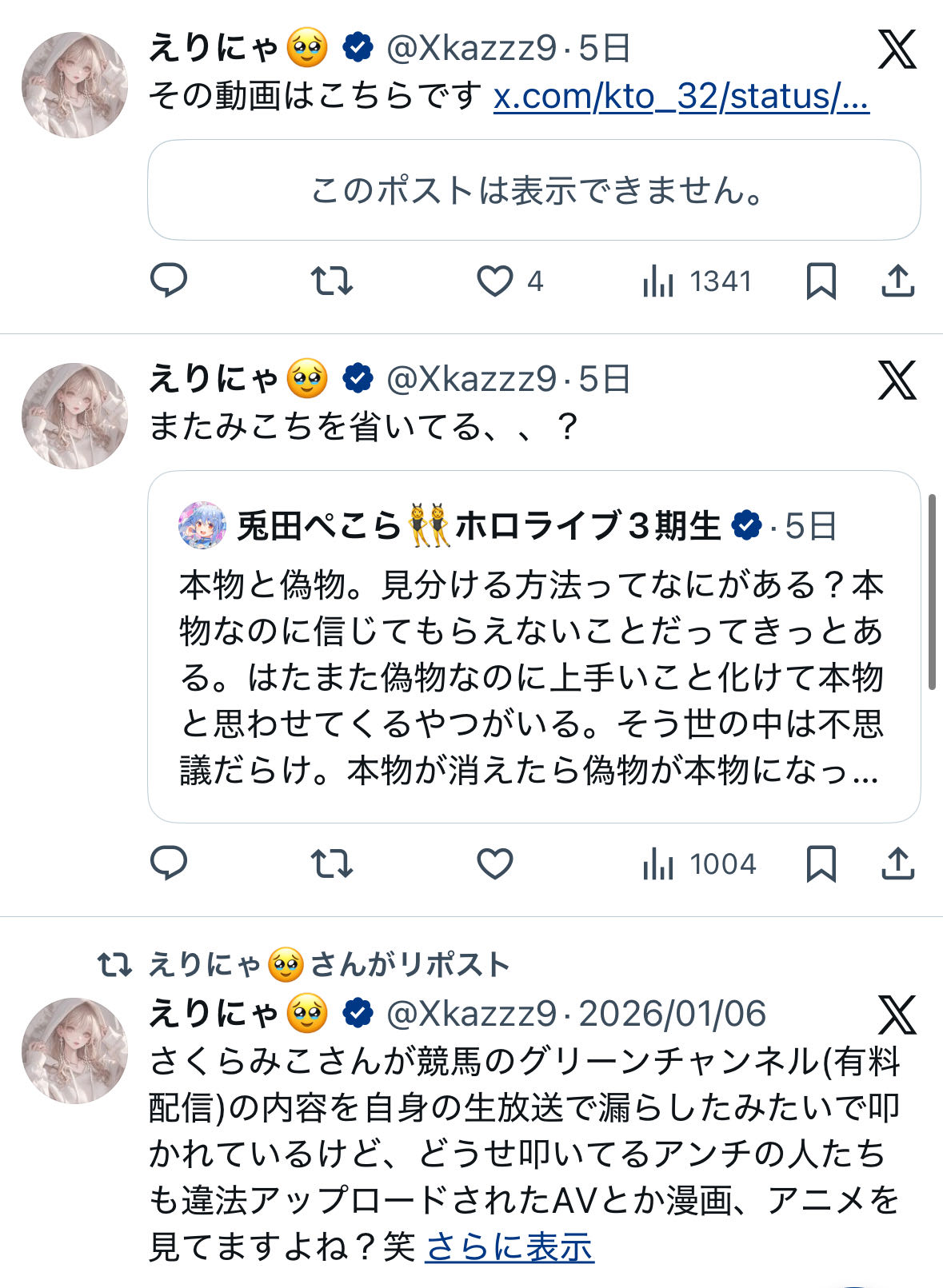 | … | 3626/01/14(水)18:32:59No.1392444094そうだねx15ローレンAV割りバレの時に不正ダウンロードみんなしてる!って擁護してたにじリスがクソほどバカにされてたの悔しかったのかよ… |
