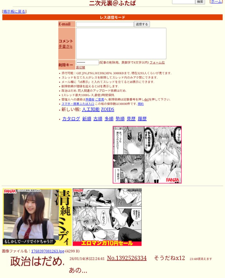 | … | 4526/01/14(水)22:46:49No.1392534025そうだねx1ピンポイントに政治と同人誌のアップロードはダメって書かれてるのにな |