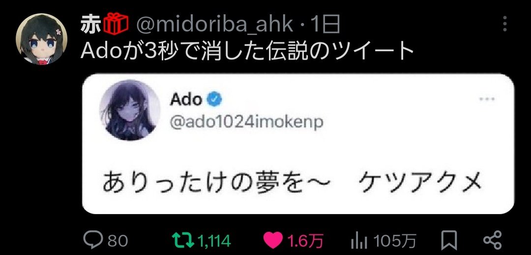 | … | 95426/01/15(木)12:54:23No.1392651775+思い出したけど「」は文豪ストレイドッグスの作者執拗に叩いてたけど |