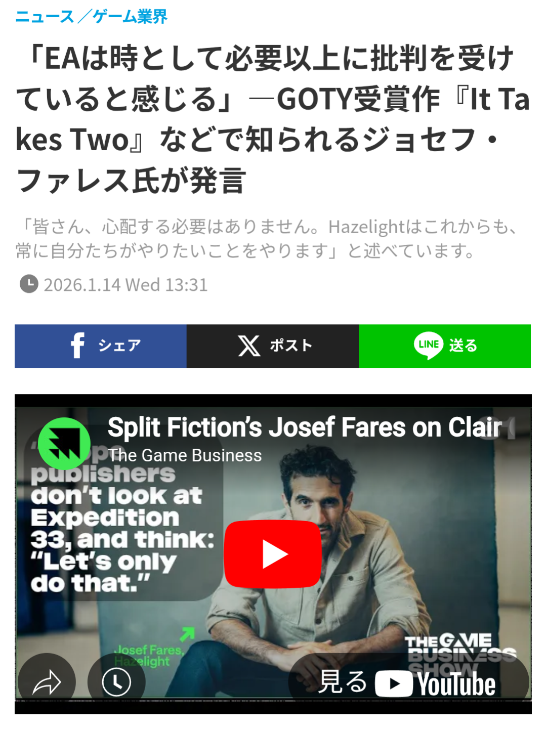 | … | 426/01/15(木)11:42:43No.1392632692そうだねx10>EAは時として、必要以上に批判を受けていると感じることが時々あります。任天堂も、マイクロソフトも、ソニーも、みんな何か良くないことをしているはずです。なのに、なぜかEAは悪者扱いされているんです。 |