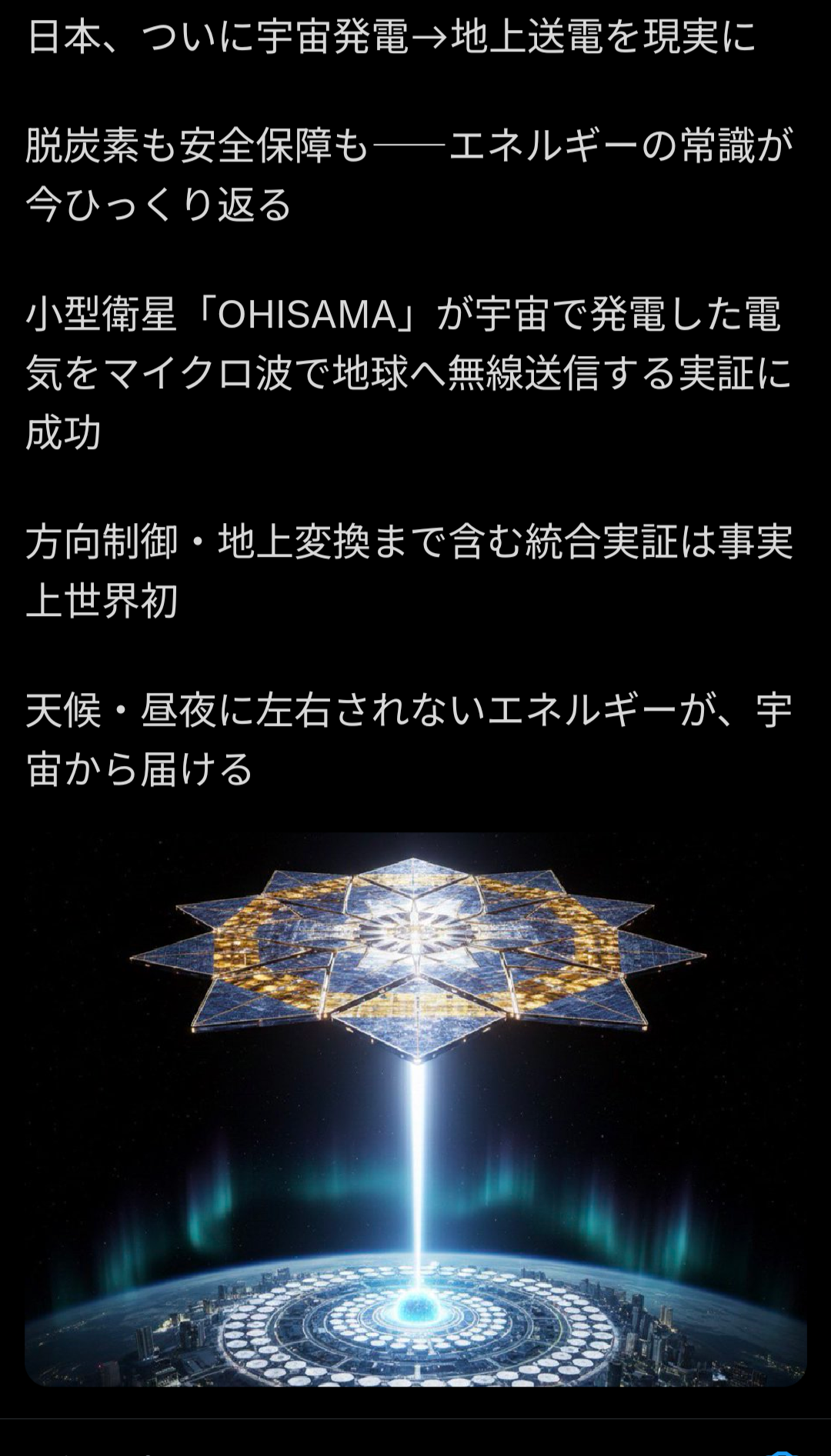 | … | 6226/01/15(木)12:31:39No.1392644739+無線送電に関しては結構前から地球上で実証実験してたからな |