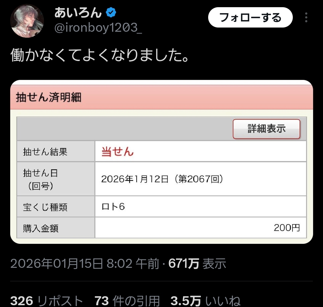 | … | 6326/01/15(木)18:52:36No.1392729395+>>人生一発逆転を狙って宝くじを買うやつなんていない |