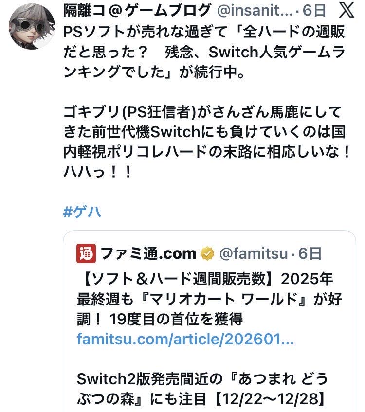 | … | 4526/01/15(木)20:32:30 ID:JafNO/I2No.1392762588そうだねx13>そもそもデマ流してるの任天堂ファンじゃん |