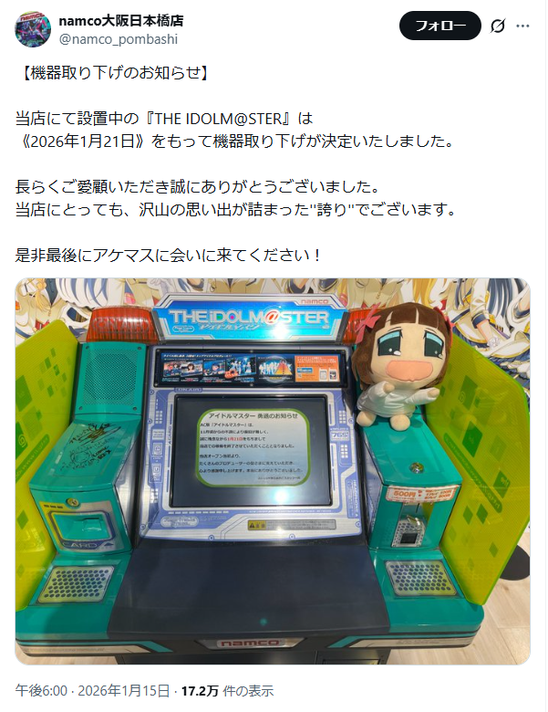 | … | 1126/01/15(木)22:06:17No.1392798648+何年も行ってないけど中野ナムコからも撤去されてる? |