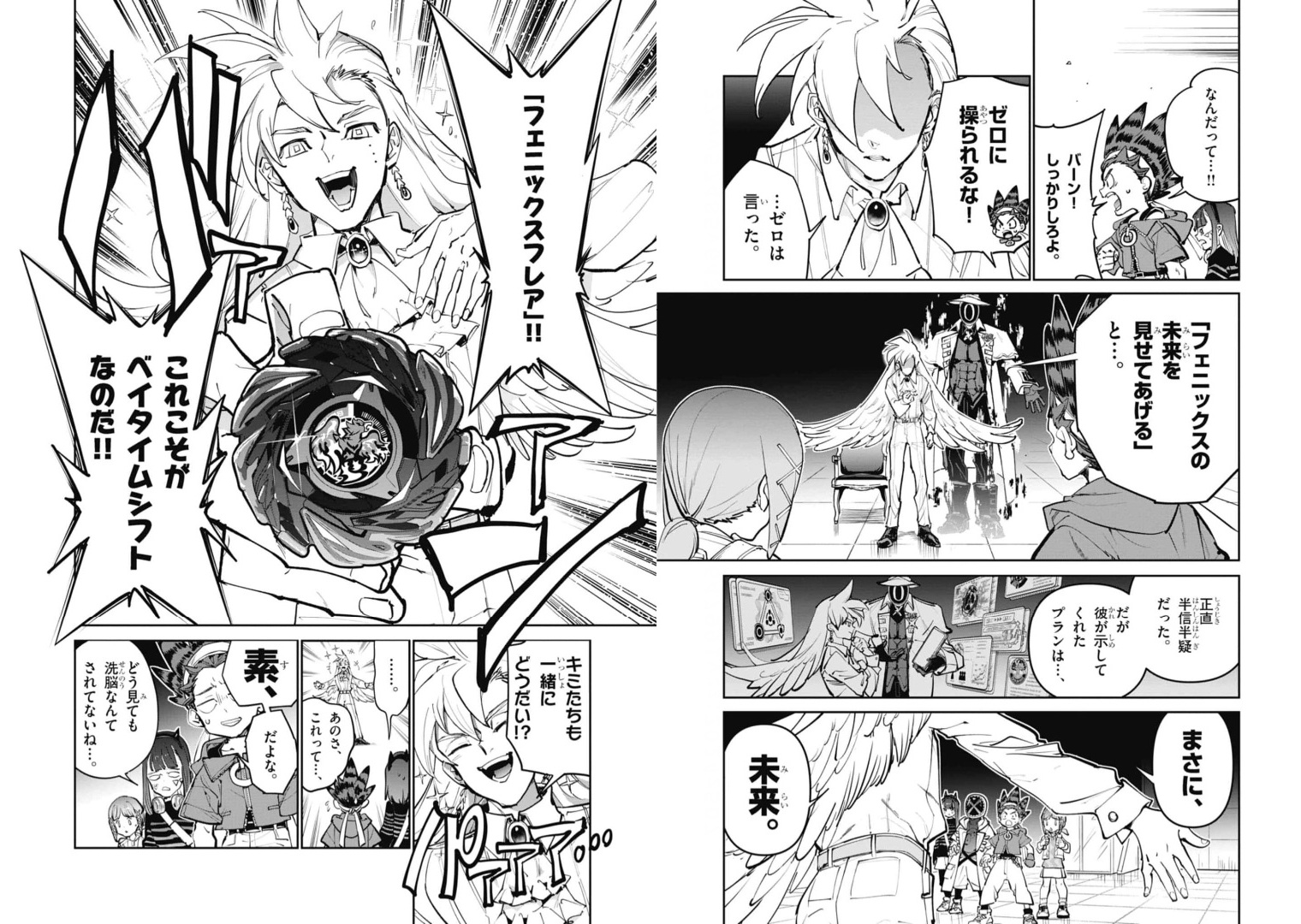 黒須ゼロから与えられた新たな未来のベイを手に、ゼロの示す未来を語るバーン。ゼロは、バトルでバーンに一人でも勝てば連れて帰ってよいという条件を突きつける。
