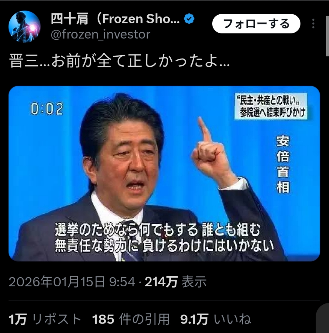 | … | 2226/01/16(金)19:44:58No.1393027588+ネトウヨって安倍政権が公明党と組んでたり統一教会と仲良しだったこと忘れたキチガイばかりなんか? |