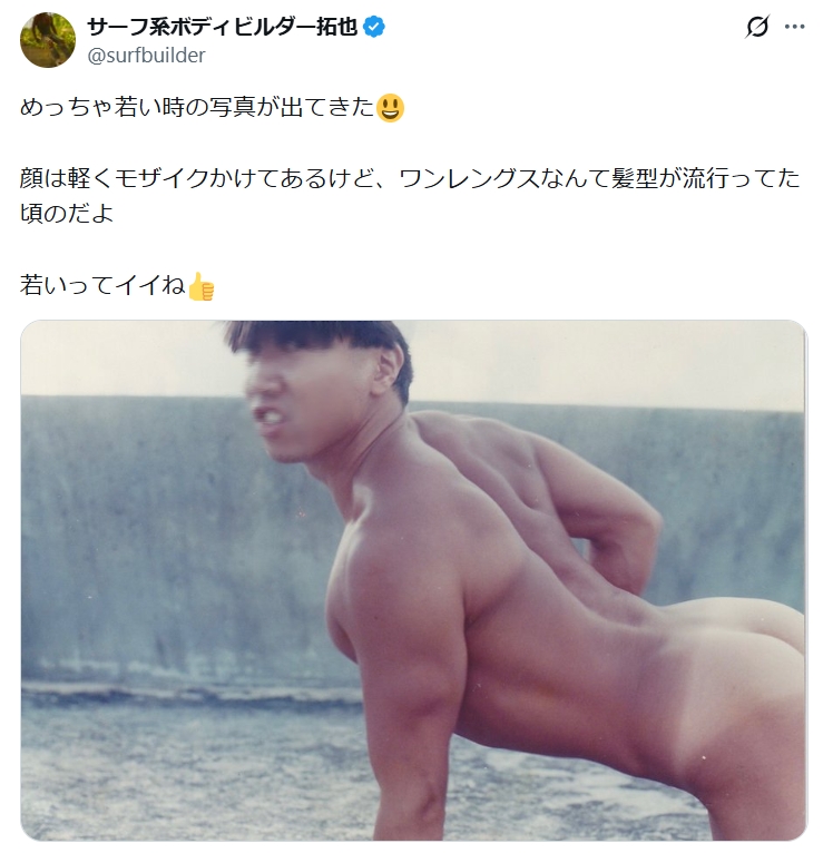 | … | 4626/01/16(金)20:15:13No.1393039286そうだねx1>乾燥途中の干し柿になったあとも売りやめられなかったのは若い頃の成功体験から手を引くことができなかったって推測を見たけど元ナンバーワンウリ専って言われても説得力あるガタイしてるな… |