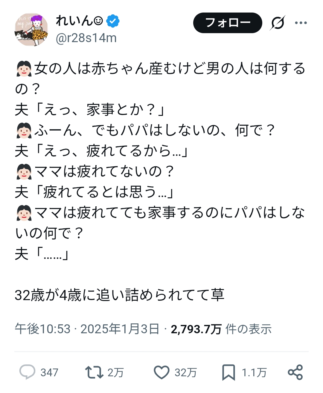 | … | 4926/01/16(金)20:43:11No.1393050834+女の人は赤ちゃん産むけど男の人は仕事してるだよ |