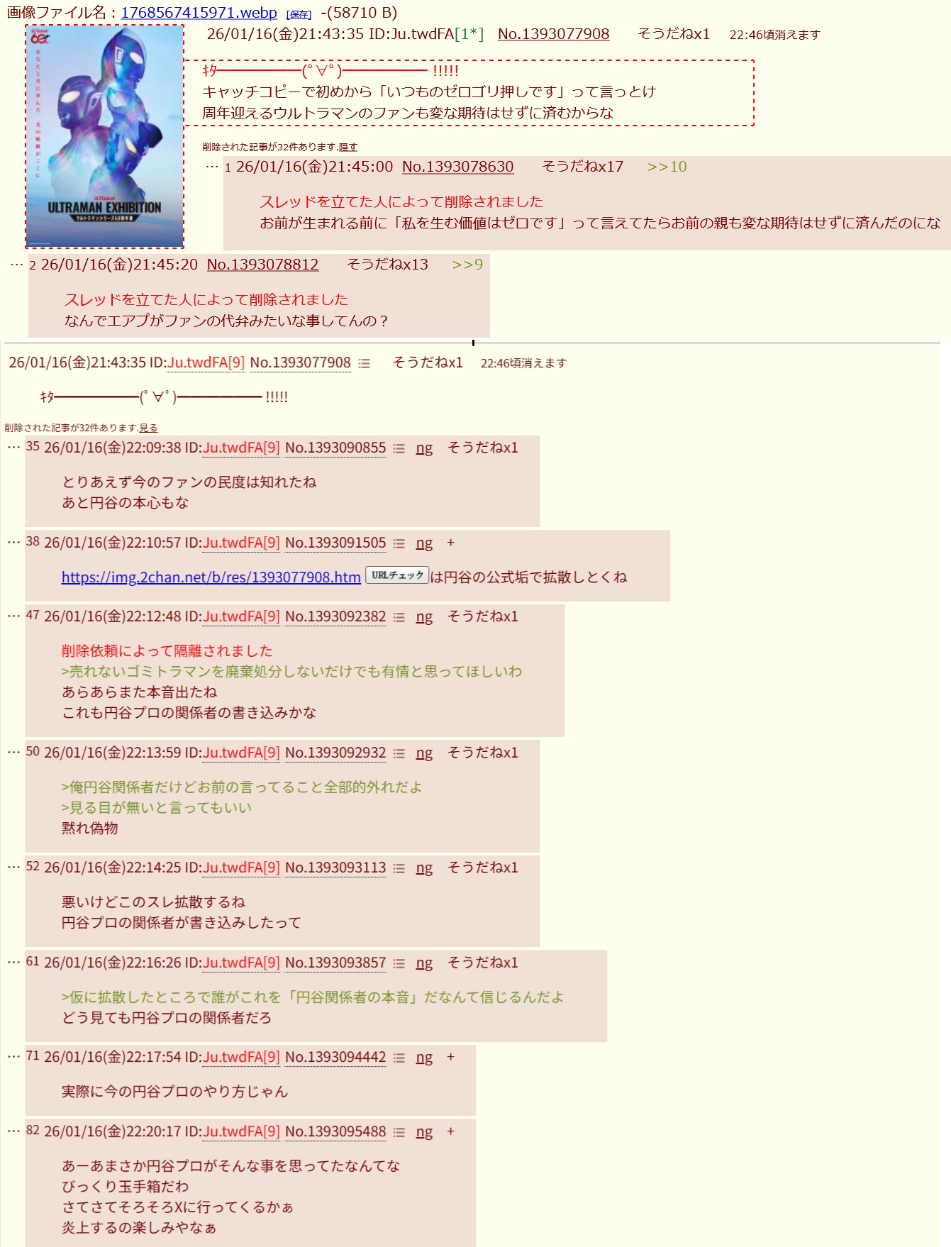 | … | 6426/01/16(金)22:17:08No.1393094141そうだねx4>>仮に拡散したところで誰がこれを「円谷関係者の本音」だなんて信じるんだよ |