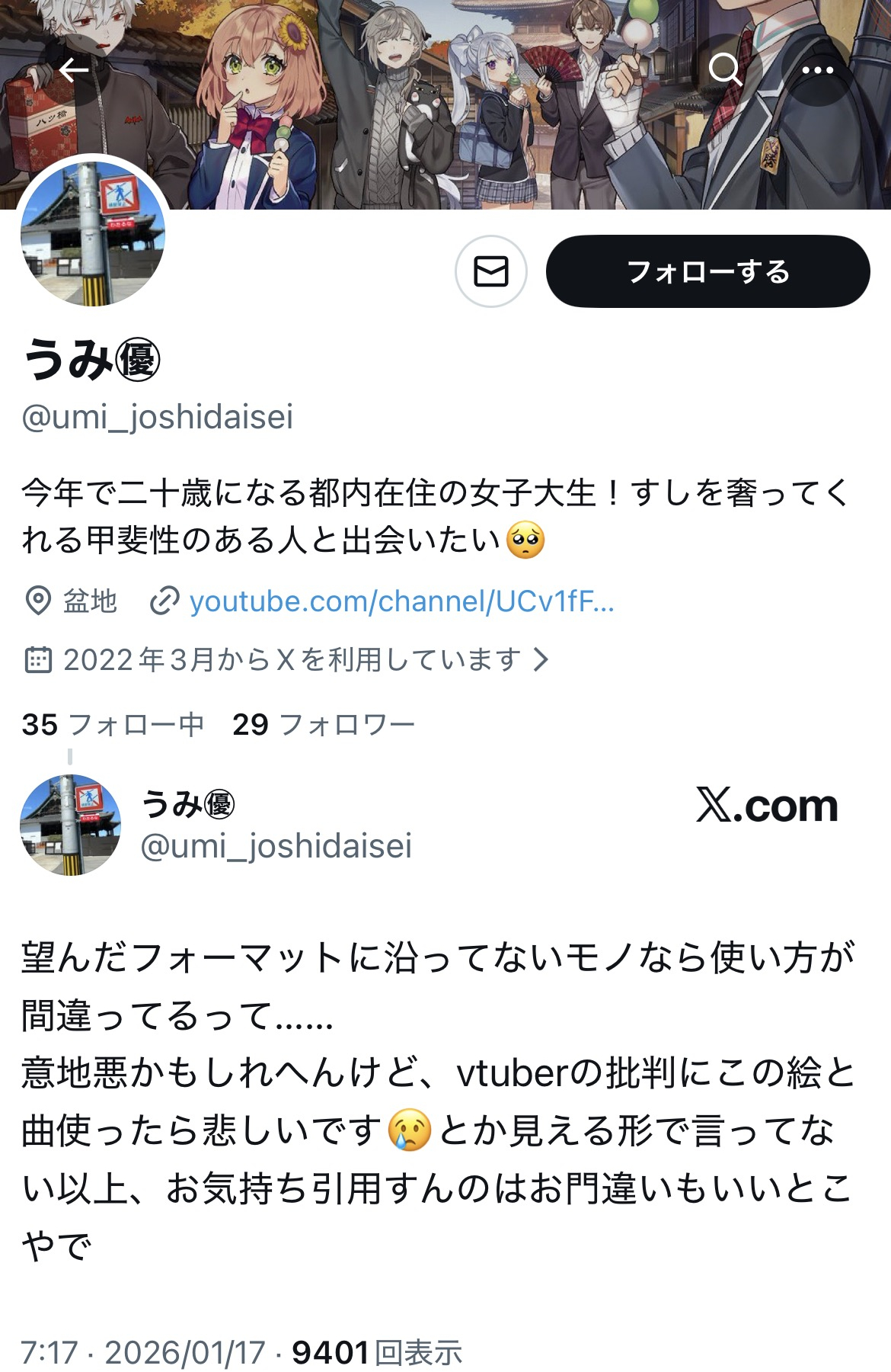 | … | 50626/01/17(土)12:47:15No.1393246803+追ってないけどしぐれういに痴漢アート描いた奴ちゃんと謝罪したのかな |