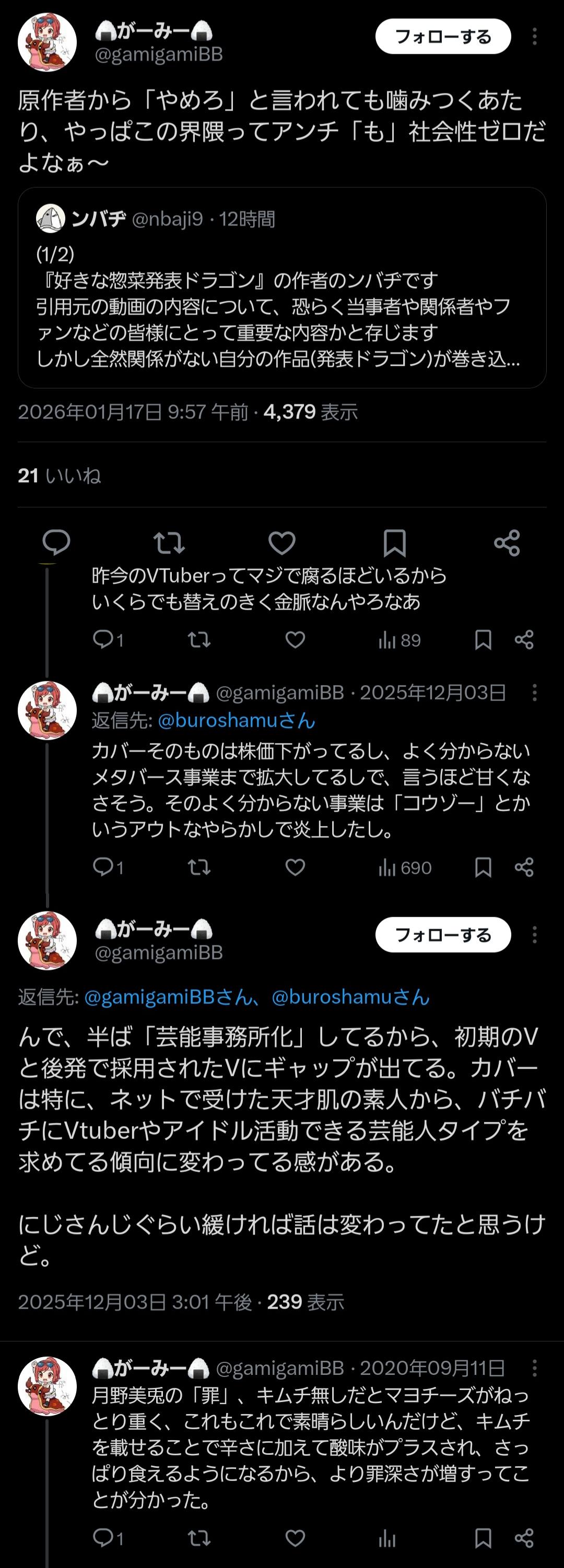 | … | 1026/01/17(土)11:33:25No.1393226451そうだねx8>Vって社会人経験がない社会不適合者が多いから自然とリスナーも質の低いのが集まってくる |