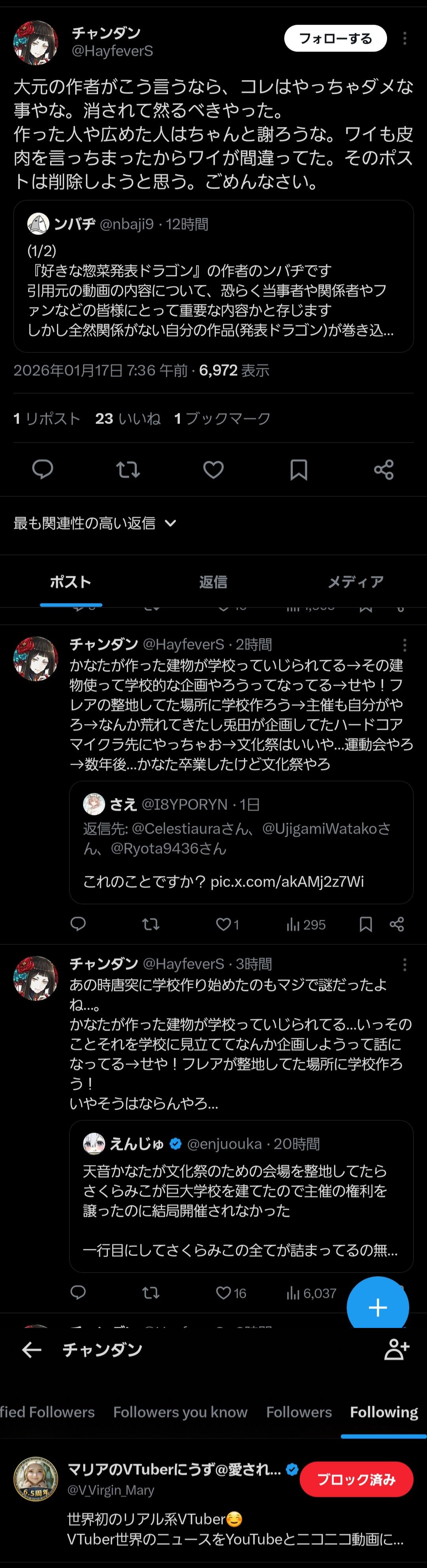 | … | 50326/01/17(土)12:46:50No.1393246655+>>小柳ロウで誤魔化してるとはいえあのエニーカラーがうちのファンが迷惑かけててーって文書内で認めてんの裏で何が起きてんだよ |