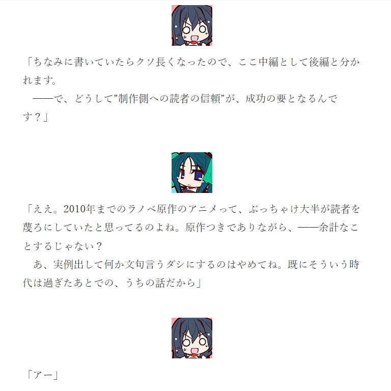 | … | 1926/01/17(土)12:14:50No.1393236854そうだねx2スレ画みたいな自分の言いたいことを美少女アイコンに対話形式で言わせるスタイル数十年ぶりに見た |