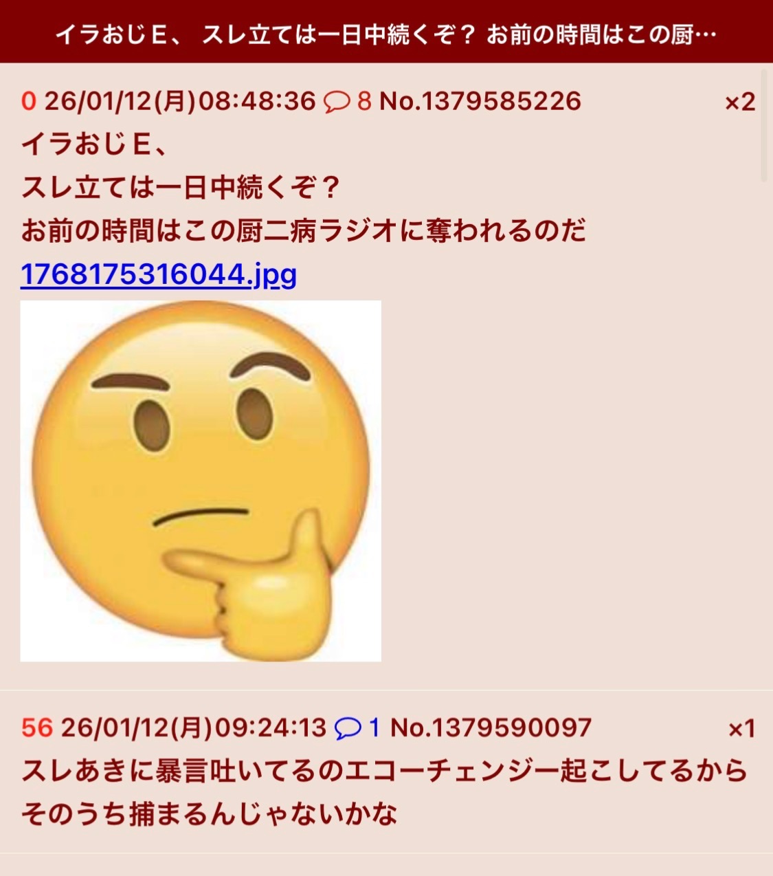 | … | 1026/01/17(土)19:41:06 ID:fnP6kMQQNo.1393373989そうだねx3架空の荒らしを名乗ってる変なのが居るってスレ立てただけでギャイーする辺り変なの本人来ちゃってるんだろうなって |
