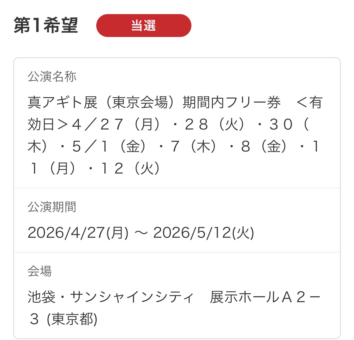 そういや今日結果発表だったよな…と思って確認したら当選してて嬉しい