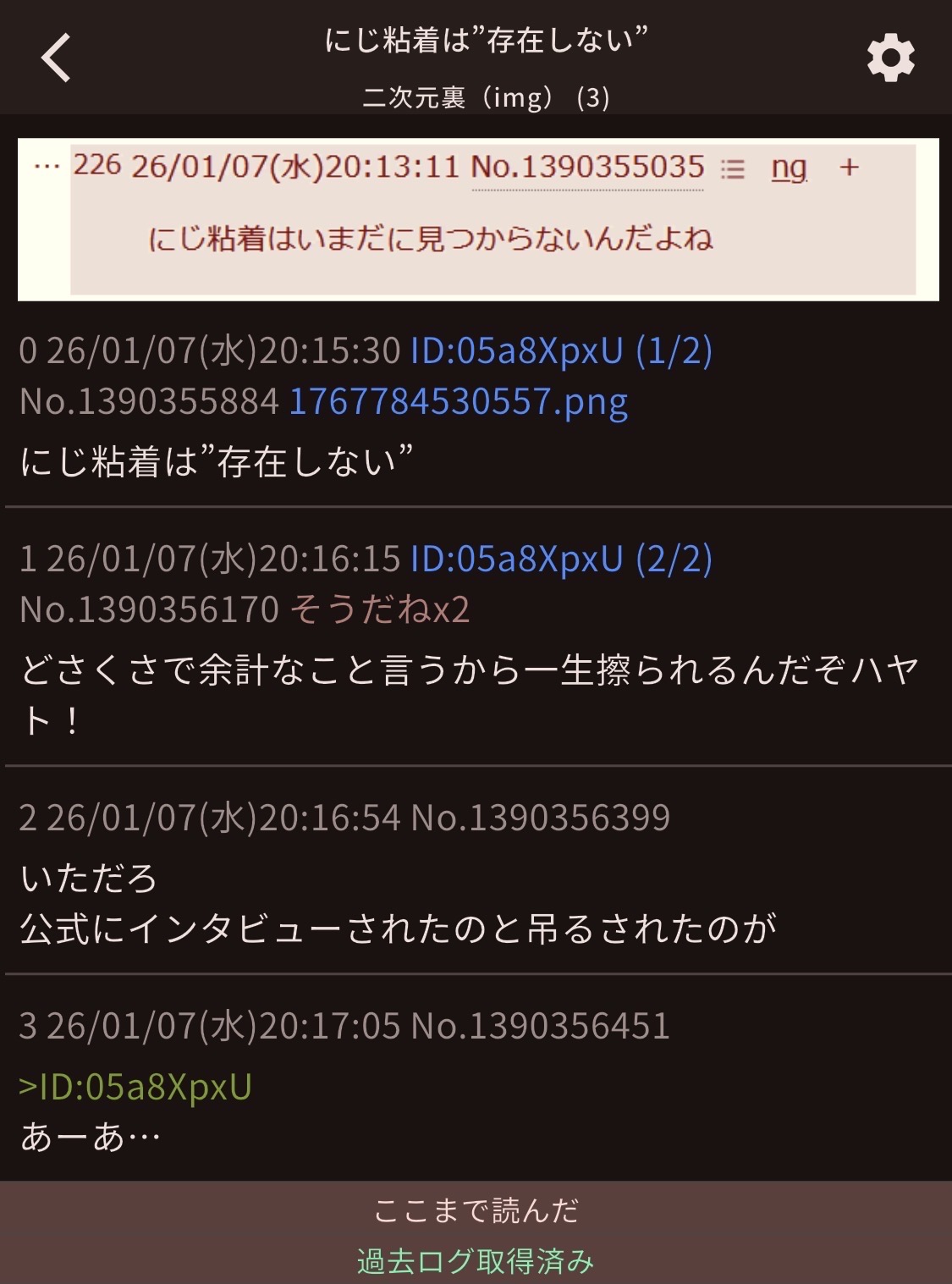 | … | 22626/01/18(日)01:49:12No.1393506901そうだねx6>勝ち誇るのはツールでID出した時だけか… |