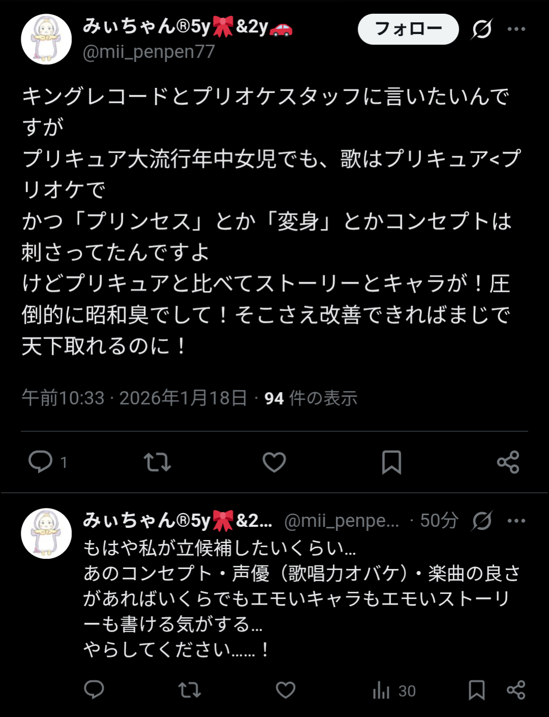| … | 1626/01/18(日)11:56:48No.1393589211そうだねx12またぷいきゅあおじさんが女児アニメの行く末を憂えてるスレ? |
