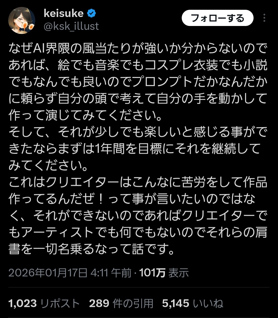 | … | 1626/01/18(日)14:03:49No.1393627496そうだねx11>AI使っておいてクリエイター名乗るなって言ってんの |