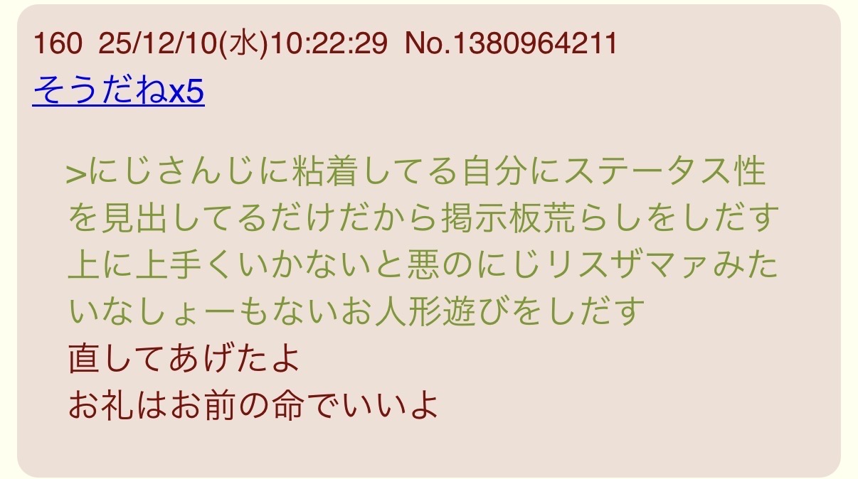 | … | 326/01/18(日)14:27:51No.1393633956そうだねx16にじリスなんてどこでも暴れてる荒らしじゃん |