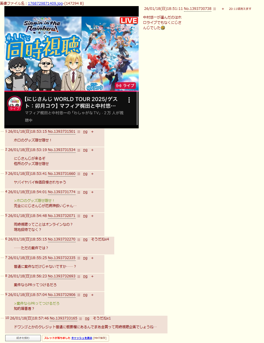 | … | 2526/01/18(日)19:53:29No.1393753246そうだねx6>現地に呼ばず案件として同時視聴させるんか… |