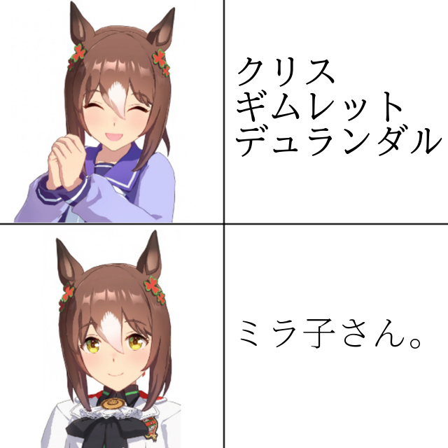 | … | 2326/01/18(日)20:05:25No.1393758111そうだねx1ただファインがミラ子をミラ子と呼ぶのもそれはそれで違和感がある気がする |