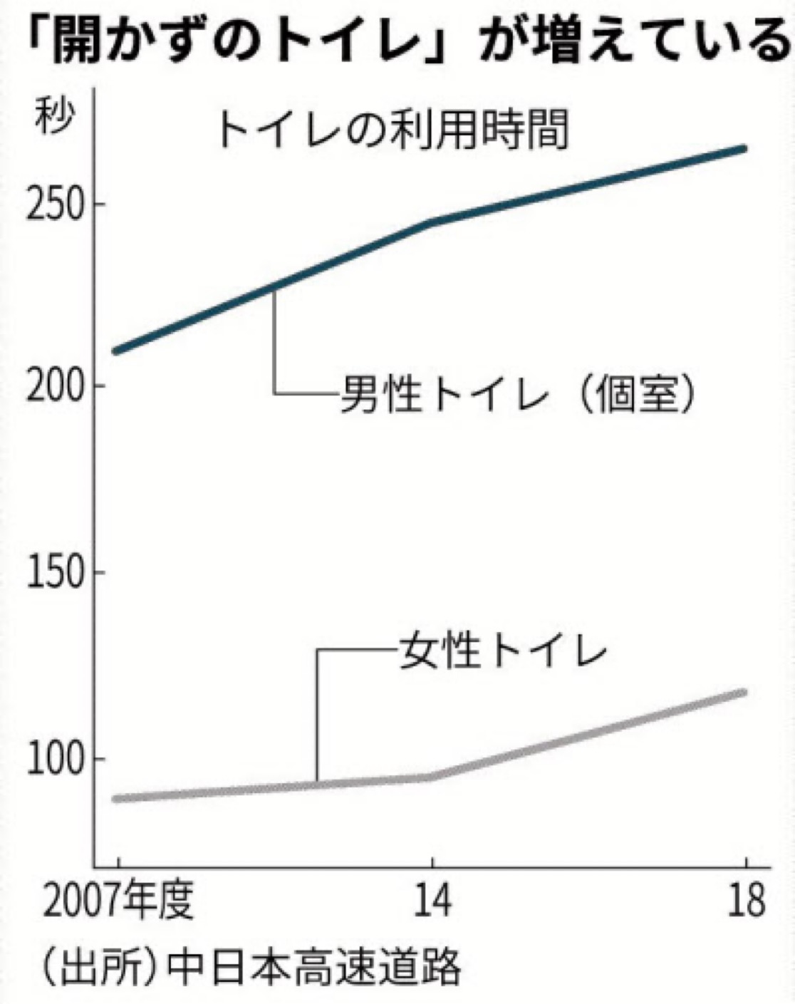 | … | 2326/01/18(日)20:29:29No.1393768954そうだねx2このグラフでわかるのはトイレの利用時間が増えたことなのになんで女叩きしてんの? |