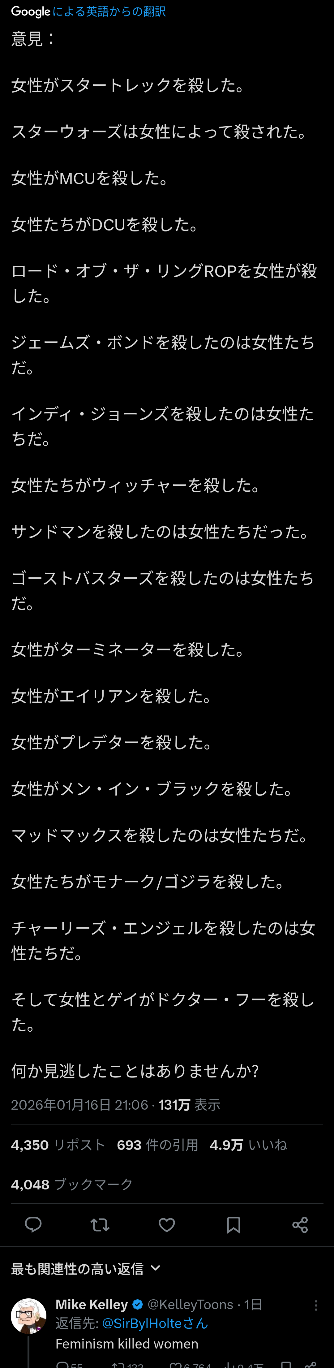 | … | 326/01/18(日)20:11:27No.1393760951そうだねx22ターミネーターエイリアンは意味が違うくねえかな!? |