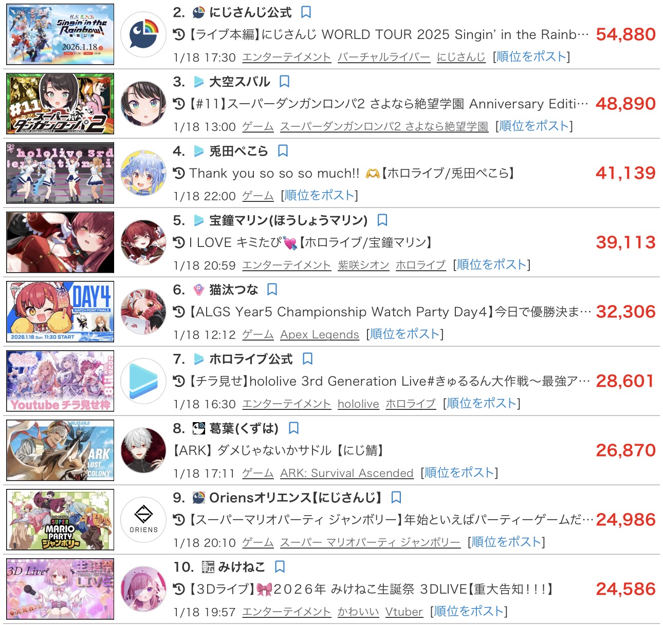 | … | 12826/01/19(月)13:10:24No.1393954180そうだねx1>>わざわざ1位避けてにじさんじトップに見せるの恥ずかしくないの |