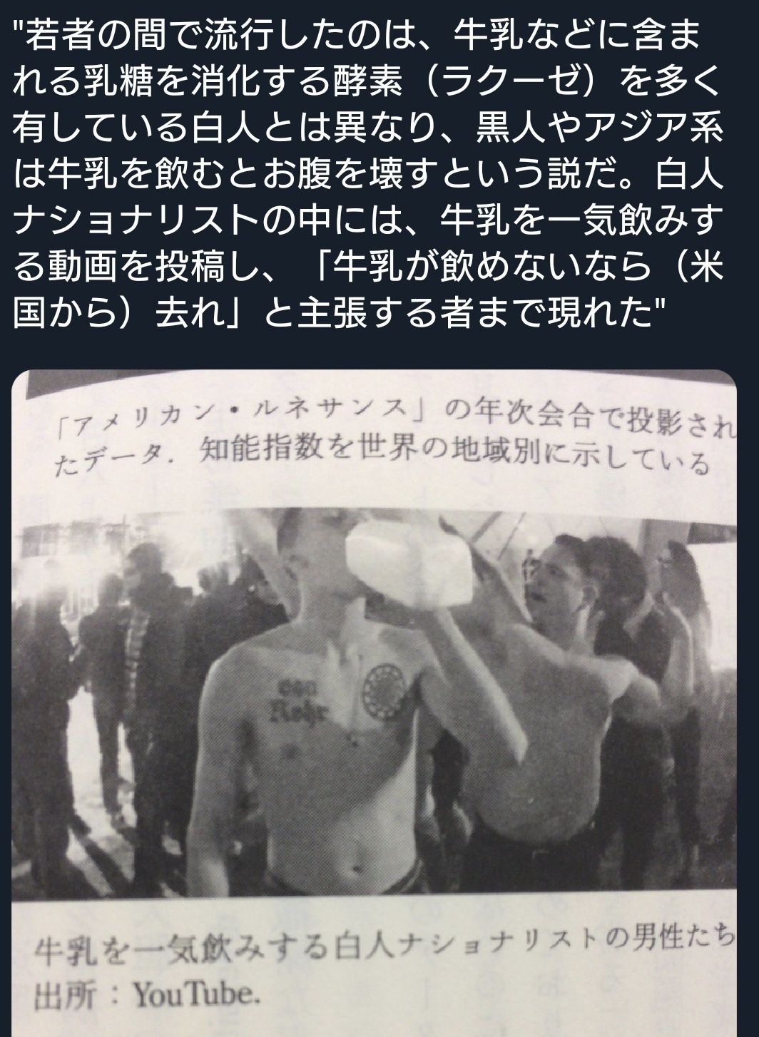 | … | 5126/01/19(月)15:48:41No.1393988136そうだねx11>これほんとに差別としてもあってアジア人もか黒人の前で牛乳飲み干すパフォーマンスする白人とかいるらしいね |
