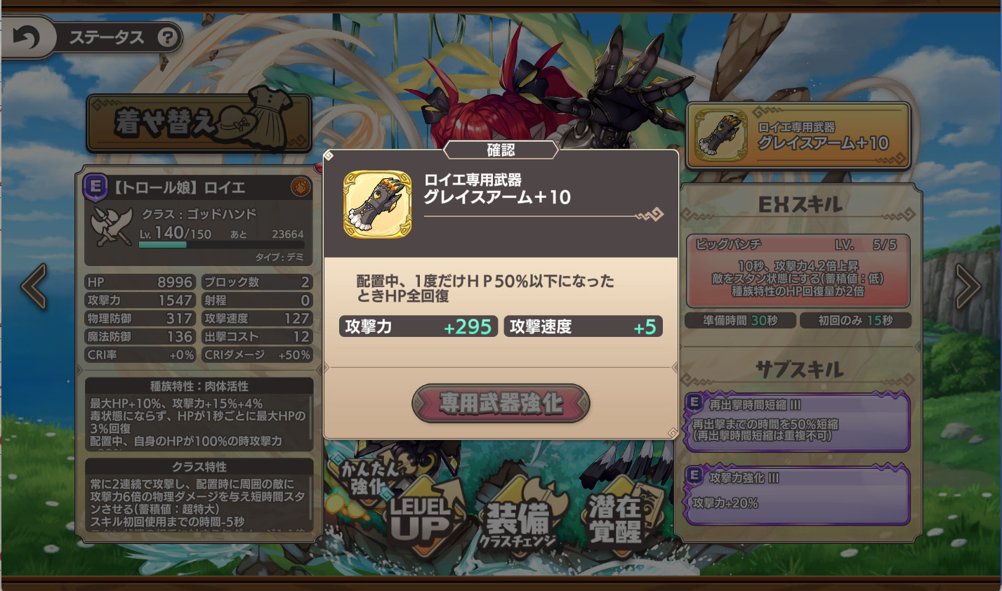 | … | 4826/01/19(月)16:33:34No.1393997089+強化で攻撃だけ伸びていくからロイエちゃんはいい専用武器もらったっすね |
