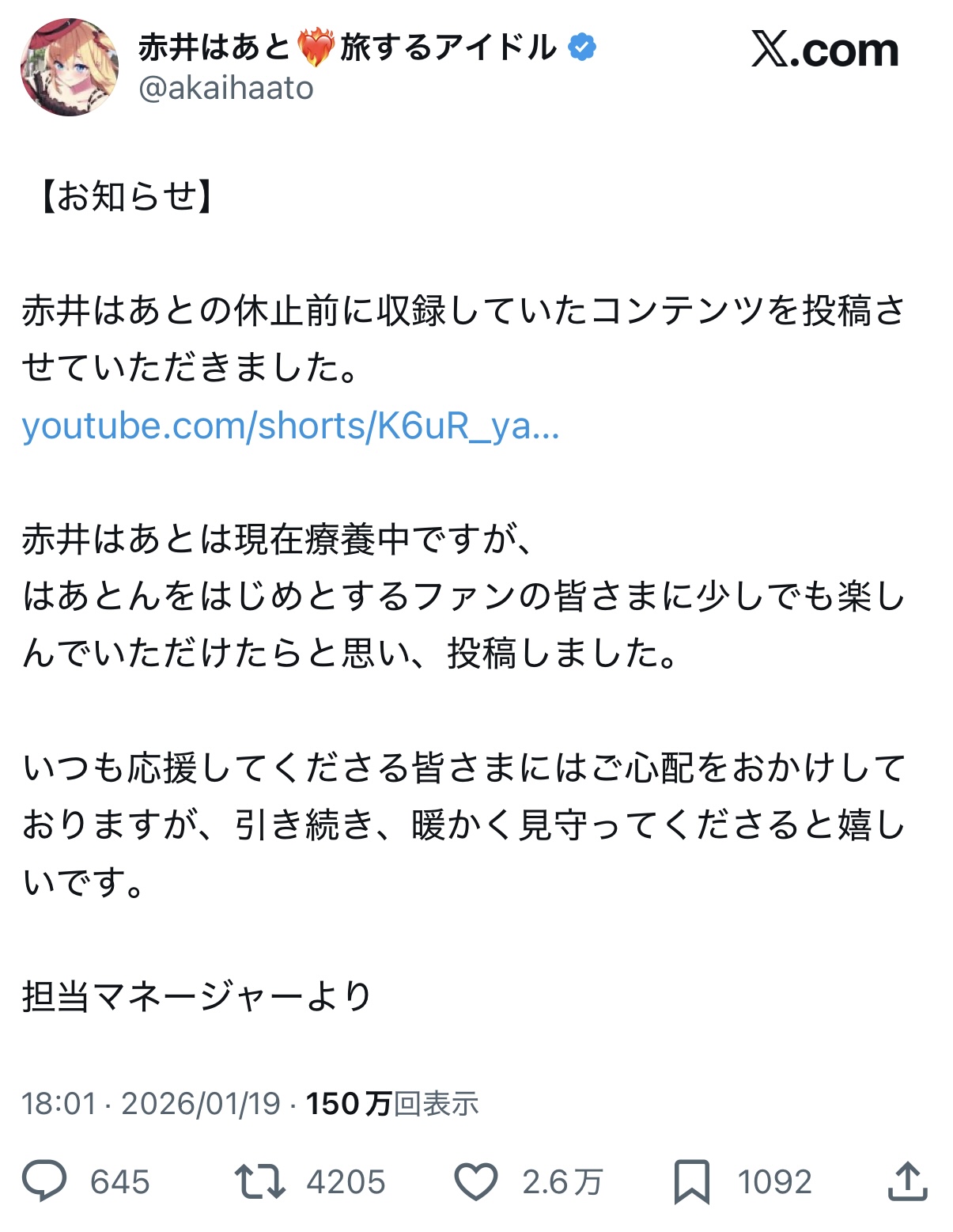 | … | 8226/01/19(月)20:51:48No.1394077701そうだねx3>https://x.com/AiaAmare/status/2012965715112869918 |