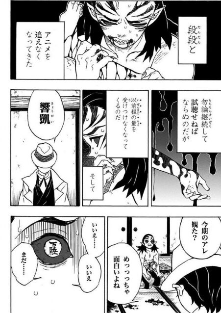 | … | 14126/01/20(火)04:19:57No.1394185531+>この画像は漫画『鬼滅の刃』のエピソードの一部で、アニメを追えなくなってきたという状況と、登場人物である響凱(きょうがい)について触れられています |