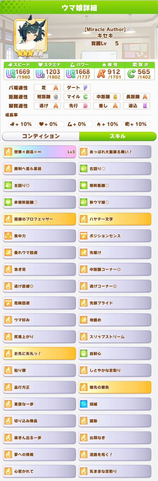 | … | 8626/01/20(火)00:33:12 ID:78bqdl6kNo.1394163380+>キセキさんの大逃げはワナですよね >普通の逃げの方がいい気がします なぜか固有スキルが弱くなりますからね いやマジで大逃げ固有弱くないですかこれ? |
