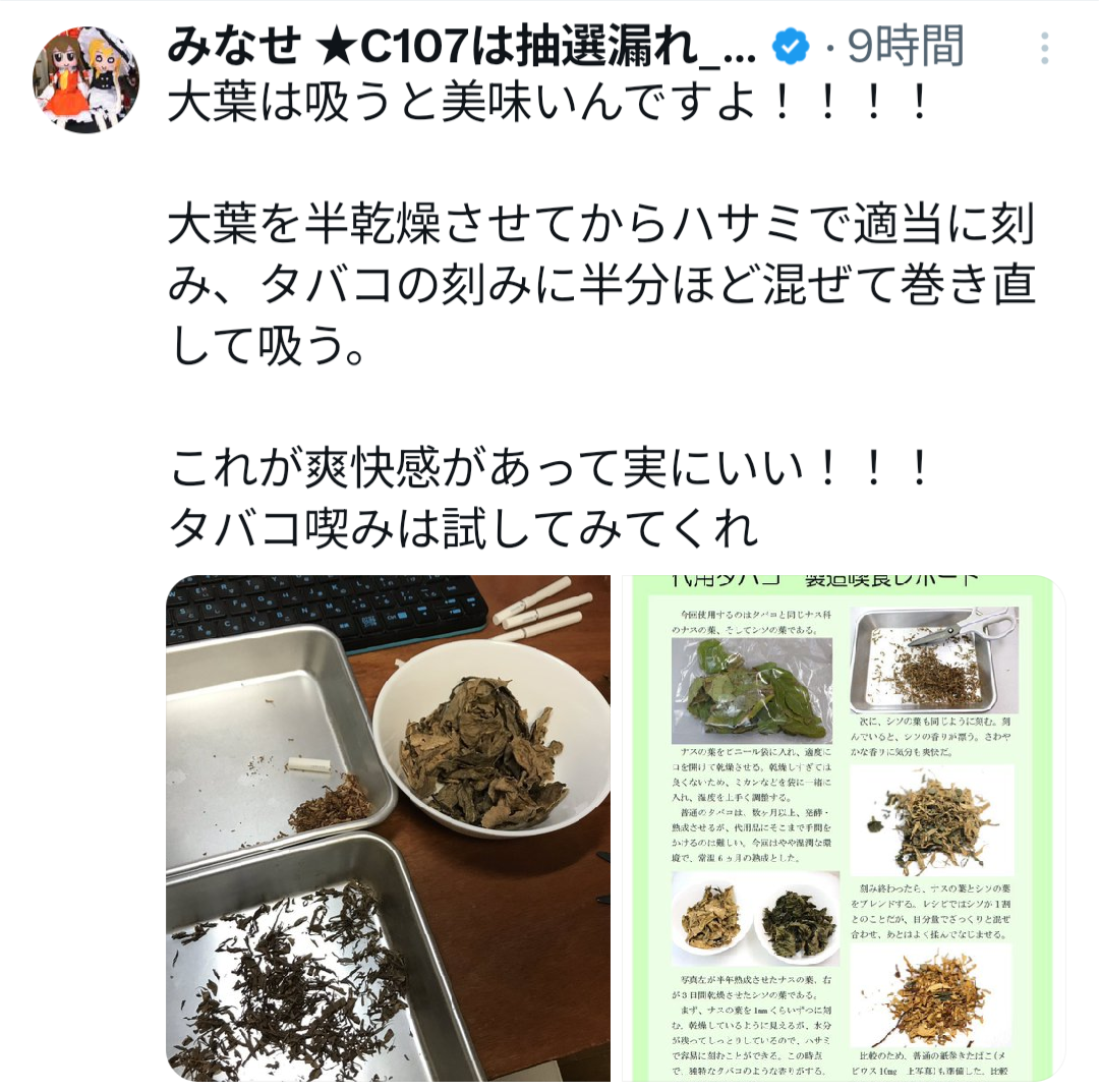 | … | 14726/01/20(火)03:17:48No.1394182885+やってることは普通のハーブをタバコっぽくして香りで楽しむ感じか |