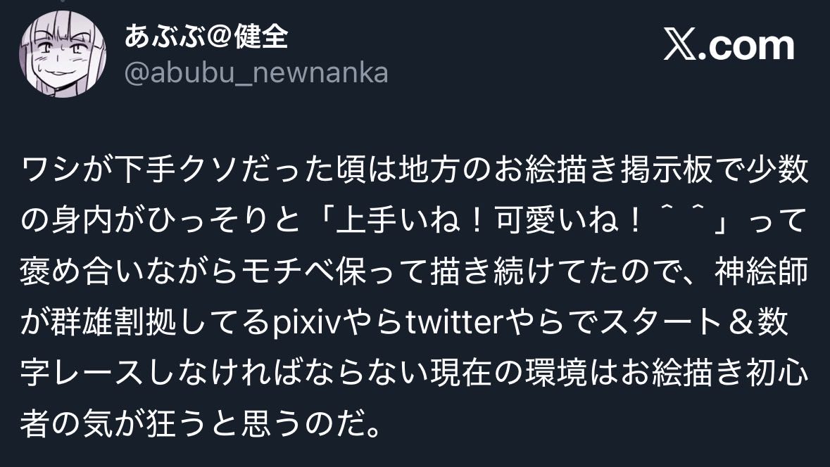 | … | 9726/01/20(火)12:36:00No.1394239673そうだねx3>>どう考えても中学くらいの子どもの絵を引用して晒し者にするだけのアカウントとかあるんだよな… |