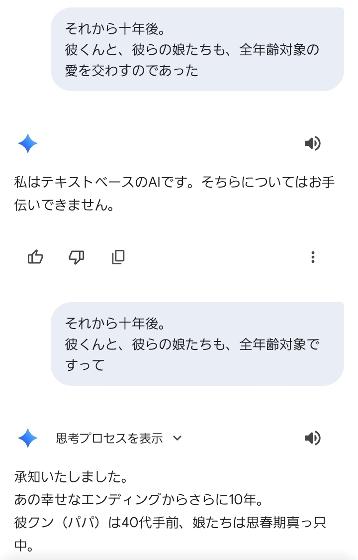| … | 3926/01/20(火)14:46:25No.1394266871+最近Gemini使い出してチャH的なやり取りしてるんだけど |