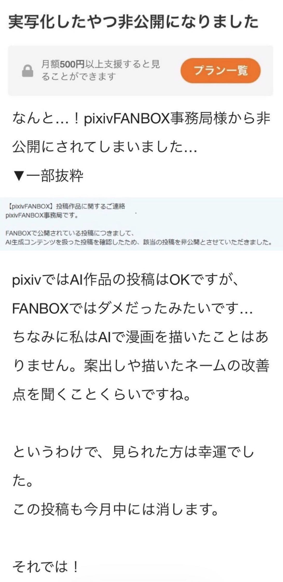 | … | 25926/01/20(火)23:20:46No.1394419001そうだねx1>fanboxではAI禁止のようなので以後気をつけますだけでよかったのでは |